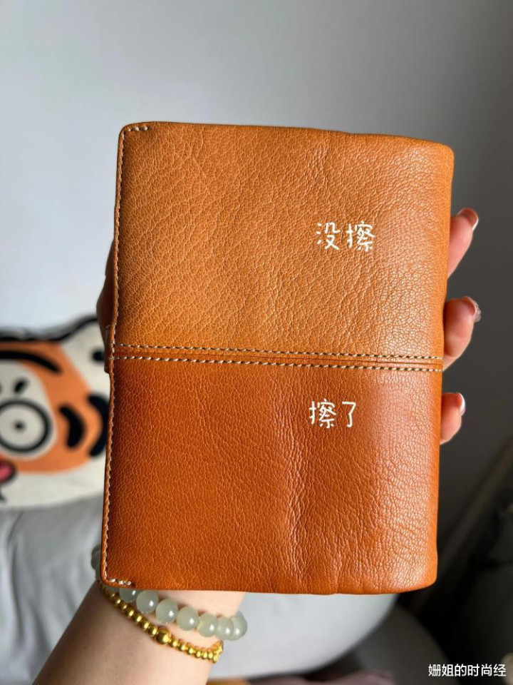 用一块干净的软布,蘸取少量护发素(注意是少量!),以打圈的方式,轻轻擦拭在皮具表面。再用另一块干净的软布将多余的护发素擦掉,皮具表面立刻恢复了滋润和光泽。