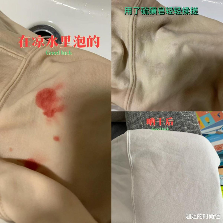 用冷水(切记!一定是冷水!)将污渍处打湿,然后用硫磺皂涂抹,轻轻揉搓,再让它静置了十几分钟,然后继续搓洗。反复一两次后,血渍基本上就只留下几乎看不见的淡淡痕迹了。