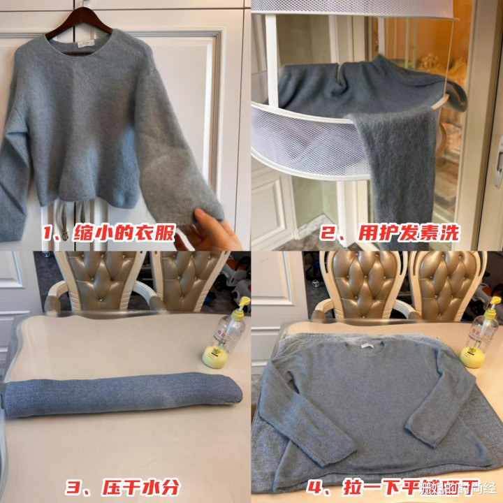 将缩水的羊毛衫浸泡在温水中,加入适量的蜂花护发素,轻轻揉搓,然后平铺晾干。你会发现,羊毛衫竟然神奇地恢复了原状!▼▼