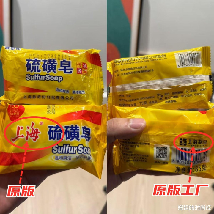 别看硫磺皂只卖几块钱,也有假冒的!买到假冒伪劣的甚至连硫磺味都没有,正版的上海硫磺皂是由上海制皂有限公司生产,“上海”字带®标志。