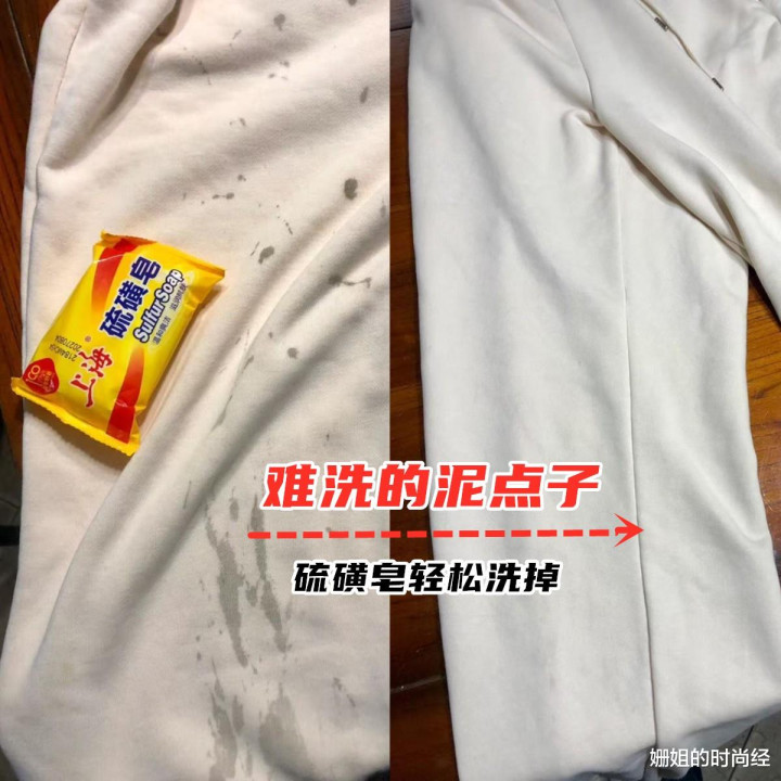 除了去黄渍,平时下雨溅在白衣服上的泥点子,用洗衣液洗很容易留一点痕迹,用硫磺皂涂抹搓洗一下,也能轻松洗的干干净净。
