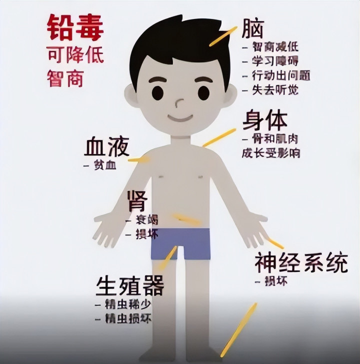 首先是铅,它是伤害神经系统的罪魁祸首,身体如果长期摄入的话,会产生不可逆的伤害,如果是小孩的话,更是会影响儿童智力发育。